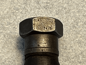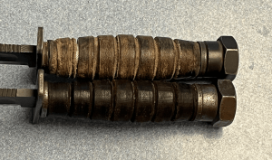 My second JPSK was from the ‘Nam era. The end of the hexagonal pommel still has some light colored paint visible. Manufacturing data was stamped on the left flat of the pommel. The letters are right-side up when the blade tip is down. That one says