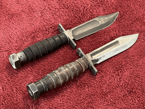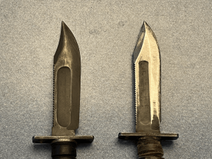 The sides of the Camillus “Nam-era blade (left) are smoothly rounded; you can see the edges of where the flats of the GWOT-era Ontario (right) blade meet