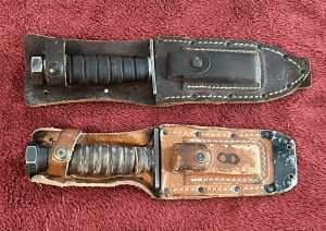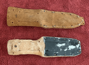 By the 1980s, a squared-off sheath with a black metal (sheet steel? aluminum?) end cap had replaced the original pointed leather sheath.