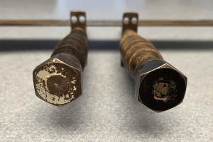 A rusted tang under the leather washers of a PAL RH-36 utility knife