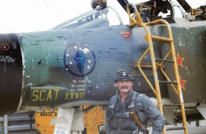 Note that Robin ran an extra loop of leather thong through the belt slots of the sheath and around the grip, tying it above the handguard, to ensure his JPSK would stay on him during a violent ejection. Emblem is of the 433rd Tactical Fighter Squadron, “Satan’s Angels,” one of the squadrons in the 8th Tac Fighter Wing Olds commanded. Image of Olds in front of his F-4, SCAT Twenty-Seven, from thevettebarn.com