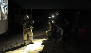 A student with a PML on an Airsoft pistol returns fire during a Heloderm theater shooting exercise