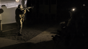 With the “outdoor theater” we used for the training in these photos, there was no ceiling except the sky and stars, so the light could not reflect off of it. The upward pointing ready kept this student from muzzling other students while turning to scan for additional threats.