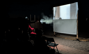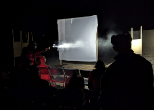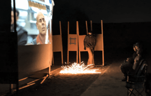Like recording a strobe or flash of lightning with a timed exposure camera, this still from a video catches the bright illumination of the whole room at the moment of muzzle blast from blanks (aimed BESIDE the students, not AT them). Before and after each muzzle flash the environment was dark, except for on the movie screen, which mostly blinded the viewers to what was not on the screen.