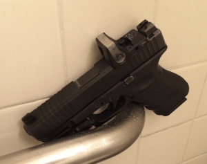 An unintended benefit: the PML makes this too wide to fall through the gap between the grab bar and the tile in this handicapped bathroom stall. With the RMR it could not be laid sideways on the grab bar, a safe alternative might’ve been to set it upside down on the floor.