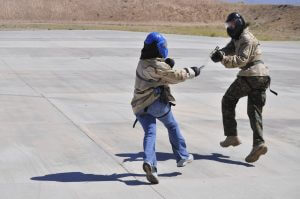 In a non-shooting class, such as Managing School Violence, this is where we will demonstrate minimum and maximum effective ranges, and practice with field expedient weapons.